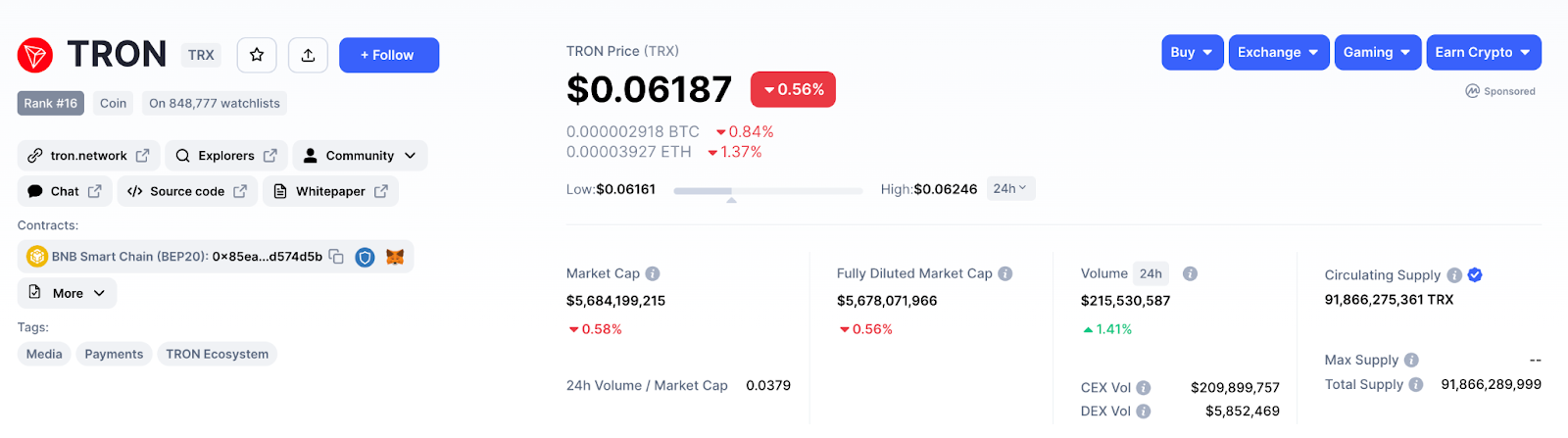 สถานะตลาดปัจจุบันของ TRON