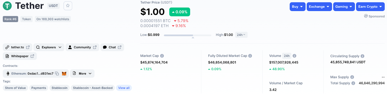 ณ เวลาเขียนที่เขียนนี้ (14 เม.ย. 2021) USDT ติดอันดับ 6 สกุลเงินดิจิทัลที่มีมูลค่าตลาดสูงสุด บนเว็บไซต์ Coinmarketcap โดยมีเหรียญทั้งหมดประมาณ 4.5 หมื่นล้านเหรียญ คิดเป็นมูลค่าตลาด (Marketcap) ได้ประมาณ $4.5 หมื่นล้าน (ประมาณ 1,414,147,500,000 บาท)
