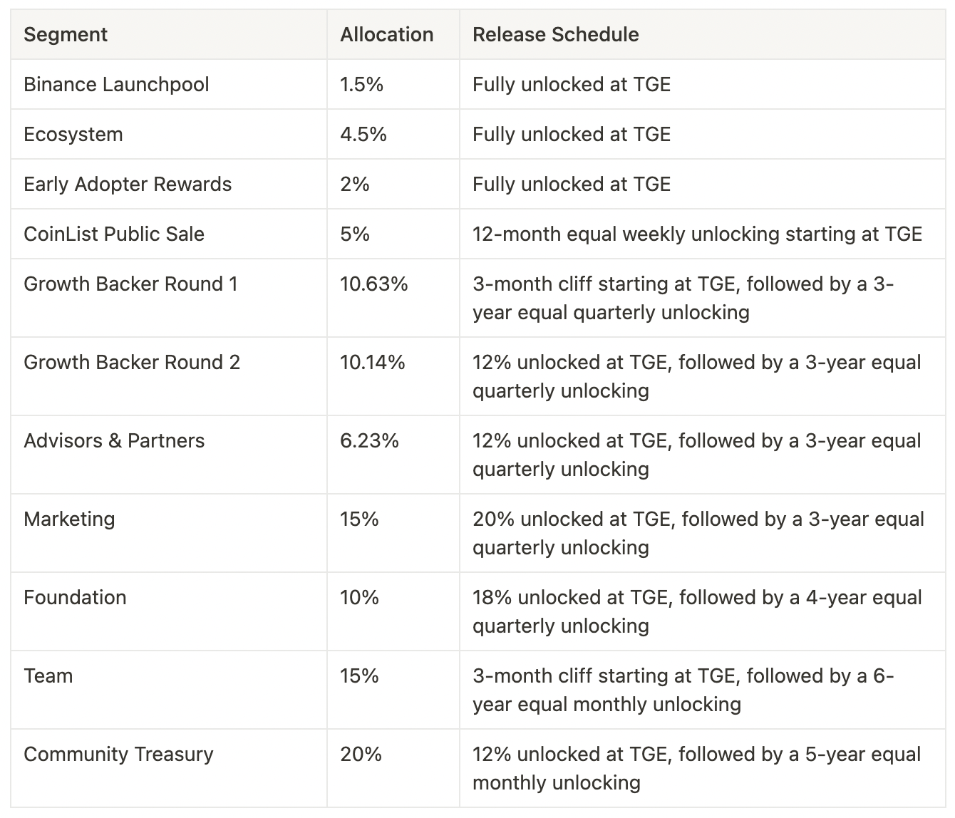 1.5% — Initial offering via Binance Launchpool, this portion is fully unlocked since TGE (token generation event).