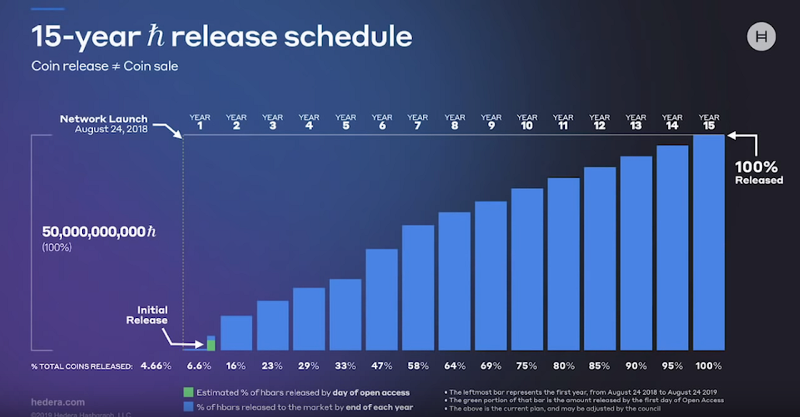 นอกจากนี้ เหรียญ HBAR ส่วนหนึ่งจะถูกล็อกเอาไว้ในวันแรกที่ถูกสร้างขึ้น และจะค่อย ๆ ทยอยปล่อยเหรียญออกมาจนครบ 50,000,000,000 HBAR ภายในระยะเวลา 15 ปี ตามตารางด้านล่างนี้
